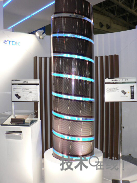 TDK在“CEATEC JAPAN 2009”上參考展出了可采用卷對卷技術一條龍生產的薄膜型非晶硅太陽能電池。該電池為柔性產品,除了可設置在曲面上使用之外,其薄型、輕量的特點使得耐沖擊性也比較高。設想用于手機等各種電子產品及住宅/戶外發電等用途。