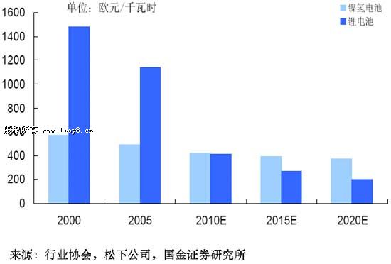 根據(jù)其分析(見圖2),雖然2010年之前鋰電池的成本高于鎳氫電池,但鋰電池的成本預(yù)計(jì)從2010年開始就將降到與鎳氫電池相當(dāng)?shù)乃剑箐囯姵氐某杀靖鼘⒚黠@低于鎳氫電池。