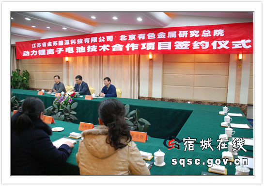 1月20日上午,北京有色金屬研究總院熊柏青副院長一行3人蒞臨江蘇省金蘇能源科技有限公司簽約動力鋰離子電池項目。市人大常委會副主任、區委書記楊明強,區委常委、宿城經濟開發區黨工委書記張聯東,副區長劉培祿等區領導參加了簽約儀式。儀式由張聯東主持。