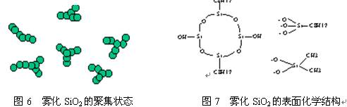 此時(shí)若再加入無(wú)機(jī)填料霧化硅石,根據(jù)聚合物中填料的表面效應(yīng),霧化SiO2的表面將強(qiáng)烈地吸附分子鏈。霧化硅石是一種無(wú)定形態(tài)的納米多孔SiO2的聚集體,其結(jié)構(gòu)形狀如圖6所示。這樣,在一個(gè)SiO2粒子的表面就可連接幾條分子鏈,使分子鏈間 形成物理交聯(lián)。同時(shí)還由于霧化SiO2 在制備過(guò)程中其表面會(huì)形成大量羥基-OH(見(jiàn)圖7),-OH與PVdF及PVdF-HFP分子鏈上的氟原子將形成強(qiáng)烈的氫鍵,從而又能形成鏈間的化學(xué)交聯(lián)。這樣就構(gòu)成了PVdF體系、PVdF-HFP體系的高分子網(wǎng)絡(luò),溶劑與增塑劑都分布在這種高分子網(wǎng)絡(luò)中。