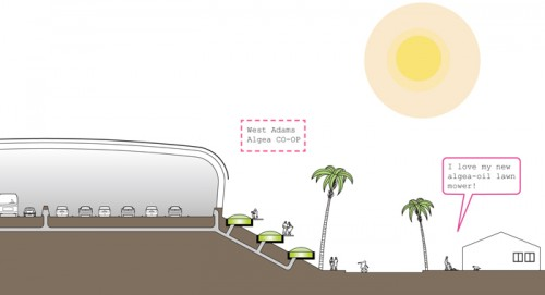 Tham給自己的計(jì)劃取了一個(gè)很恰當(dāng)?shù)拿郑?ldquo;天堂里的太陽(yáng)能巨蟒”(Solar Serpents in Paradise),這條巨蟒還可以在高架橋下為電動(dòng)汽車(chē)提供充電站,而豐富的二氧化碳,也將為路邊的海藻池提供豐富的養(yǎng)分。海藻聚積起來(lái)之后,還可以收割了用作生物燃料。