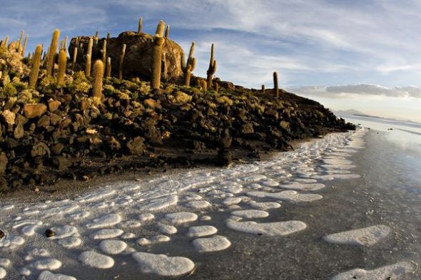 烏尤尼鹽沼上一座長滿巨型仙人掌的小島顯得特別突出。根據當地傳說,這片鹽沼是在一位巨人用母乳喂養兒子時,眼淚與乳汁結合在一起形成的。事實上烏尤尼鹽沼是在數千年前形成的,當時這里被咸水湖覆蓋。湖水干涸后,留下的礦物豐富的鹽水形成現在的鹽沼。
