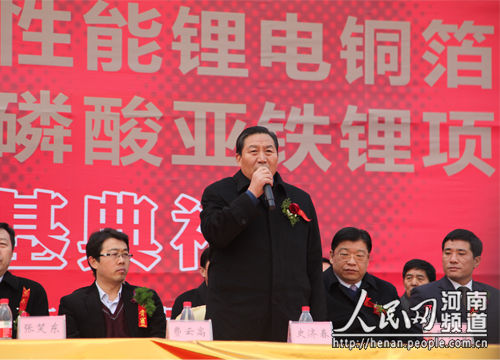 人民網(wǎng)安陽12月19日專電 12月18日上午,河南紅日投資集團(tuán)年產(chǎn)1萬噸高性能鋰電銅箔、年產(chǎn)1萬噸磷酸亞鐵鋰項(xiàng)目開工奠基儀式在安陽市(北關(guān))紡織產(chǎn)業(yè)集聚區(qū)隆重舉行。河南省副省長史濟(jì)春、國家高科技節(jié)能減排促進(jìn)中心常務(wù)副主任馬強(qiáng)、安陽市市委書記張廣智、市長張笑東等重要領(lǐng)導(dǎo)出席了儀式,并為該項(xiàng)目共同奠基培土。