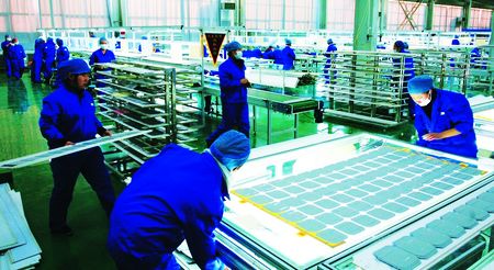 12月27日,寧夏銀星能源股份有限公司的工人正在組制太陽能電池板。目前,該公司已形成100MWp電池組件的生產(chǎn)能力。