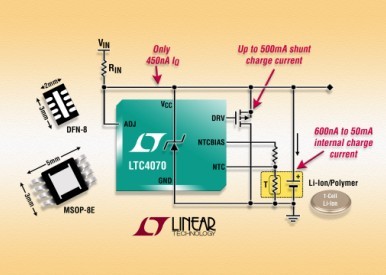 凌力爾特公司 (Linear Technology Corporation) 推出面向鋰離子/聚合物電池、易于使用和纖巧的并聯電池充電器系統 IC LTC4070。該器件以其 450nA 的工作電流,用以前不能使用的非常低電流、斷續或連續充電電源,對電池進行充電和保護。增加一個外部 PMOS 并聯器件后,LTC4070 的充電電流可以從 50mA 提高到 500mA。一個內部電池熱量查驗器降低浮置電壓,以在電池溫度升高時保護鋰離子/聚合物電池。通過串聯配置幾個 LTC4070,可以平衡并給多節電池組充電。LTC4070 采用扁平 (0.75mm) 8 引線 2mm x 3mm DFN 封裝,僅用需要與輸入電壓串聯的單個外部電阻器,就可以提供一個完整和超緊湊的充電器解決方案。該器件的功能非常適用于連續和斷續、低功率充電電源應用,其中包括鋰離子/聚合物電池備份、薄膜電池、幣形電池、存儲器備份、具有備份的太陽能供電系統、嵌入式汽車系統以及能源提取/收集系統。