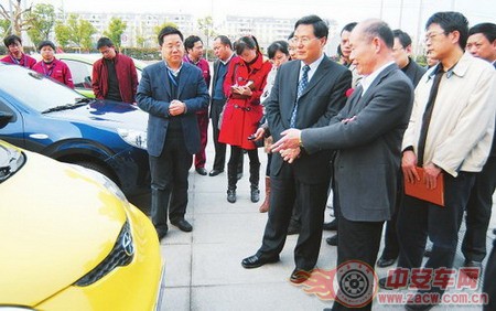 合肥市市長吳存榮在聽取相關人員介紹新能源汽車