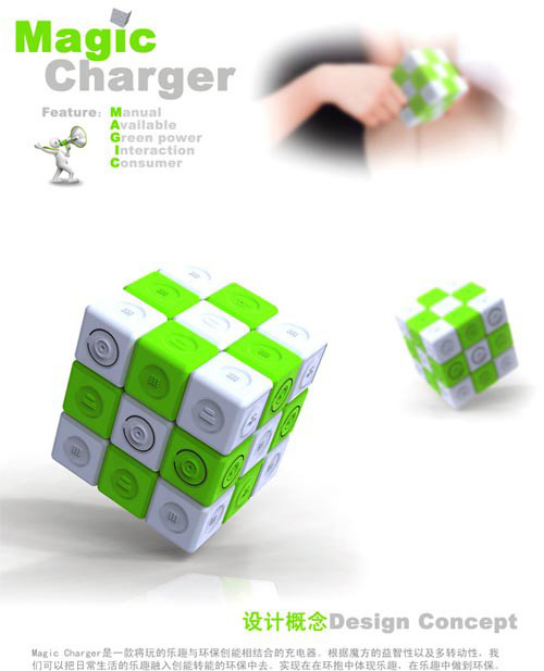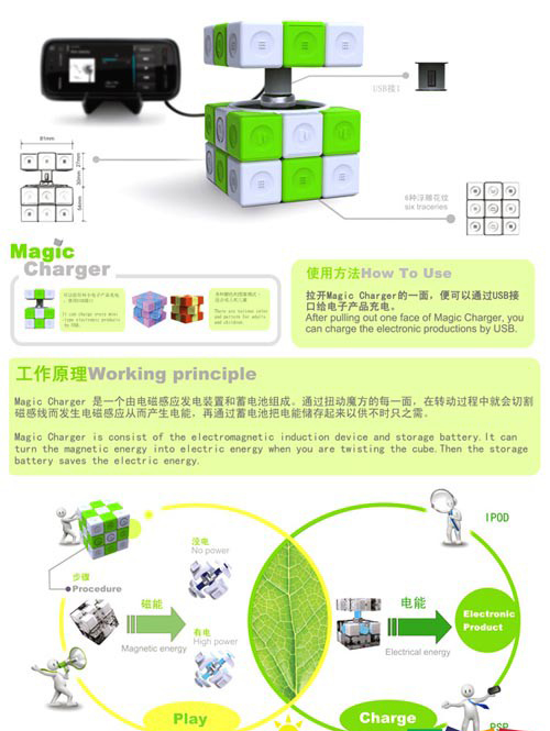 魔方充電器是由電磁感應發電裝置和蓄電池組成,通過扭動魔方的任意一面,在轉動過程中就會切割磁感線,從而發生電磁感應產生電能,再通過蓄電池把電能儲藏起來以供不時之需。在旅行中帶上它,就可以隨時給手機,MP3等數碼產品供電了。