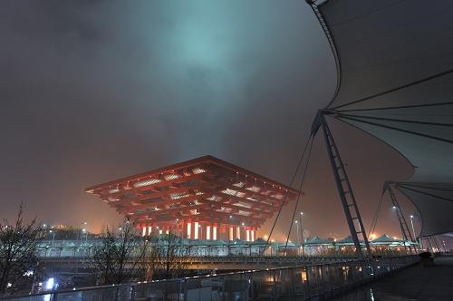 正值春雨連綿,遠望去中國館的斗冠紅柱仿佛增了些飄渺,別樣味道。