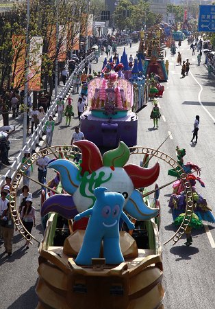 大型世博花車在世博會浦西園內巡游,巡游花車采用了“零排放”電池驅動。