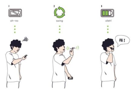 這款手機電池除了使用正常電源充電模式以外還可以在必要時利用手指旋轉為其充電。據設計者介紹,將其轉動130次可供電話通話2分鐘。