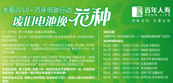 “廢舊電池換花種”社區行活動將在5月29日至6月5日舉行,百年人壽志愿者屆時將深入到市內四區的林景、勝利、九三、新華綠洲、龍鑫、天河新苑等6個社區以及東北財經大學和大連海事大學兩所高校進行舊電池換花種及低碳知識宣傳活動。在活動現場,每個家庭(寢室)憑一份廢舊電池可換取花種一份。據了解,廢舊電池對于環境的破壞非常大,一節一號電池爛在土壤里,可以使一平方米的土地失去利用價值;一枚紐扣電池能污染60萬升水,相當于一個人一生的飲水量。所有回收的廢舊電池,百年人壽將統一通過專業渠道進行環保處理。