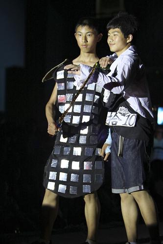 當晚,該校105名學生“模特”展示了用廢光盤、塑料袋、廢舊磁帶、一次性桌布等材料自制的“環保時裝”。
