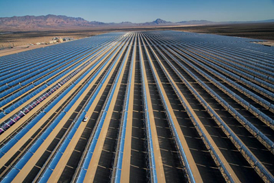 集中式太陽能在拉斯維加斯附近內華達州的一個太陽能場,管道般長排下來的反射鏡片吸收了太陽光聚焦,轉化足夠的熱量生產蒸汽驅動一個64兆瓦的發電廠。公用事業很支持這樣的系統,也稱為太陽熱能,比光伏太陽能昂貴。