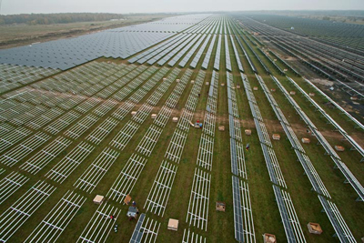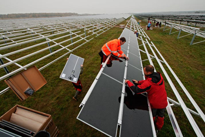 工人安裝在太陽能電池板,這里橫跨超過二百七十零英畝,是前東德的軍事基地。這里將輸送40兆瓦到Waldpolenz太陽能公園。于2008年底建成,是世界第四大光伏電站。太陽能在德國的利益來源于對太陽能源電力生產商補貼的規定。旨在大力發展太陽能基礎設施,政府鼓勵的效果十分顯著。