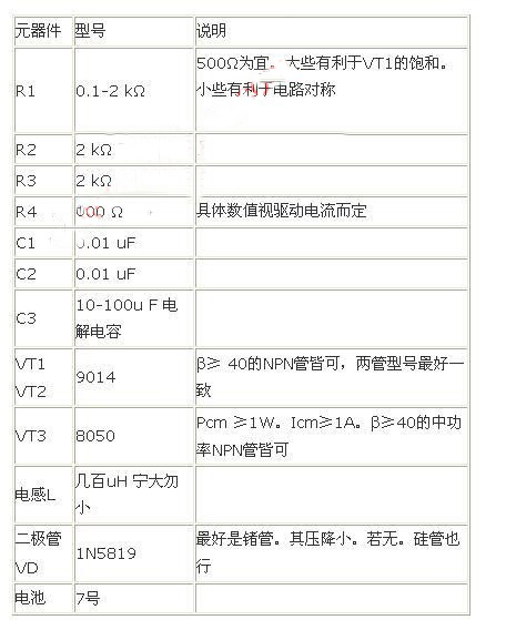 現(xiàn)進(jìn)行估算。驅(qū)動(dòng)一個(gè)LED約要100mW。電源的Po約為20mW。為了保證供給,按P=100mW計(jì)算。取η=80%,再隨便找一個(gè)幾百uH的電感,如500 uH:另一方面,根據(jù)能量守恒。3.3V約為1.2V的3倍。再由于效率問(wèn)題。電感的驅(qū)動(dòng)電流差不多要LED工作電流的3-4倍,就取為120mA,這樣一來(lái)。便可算出振蕩頻率為34kHz左右,這樣,取R=2kΩ,C=0.01 uF便能達(dá)到要求。確定參數(shù)時(shí)。頻率可高不可低,電感寧大勿小,這樣才能保證輸出功率足夠大,才能有足夠的調(diào)節(jié)空間。