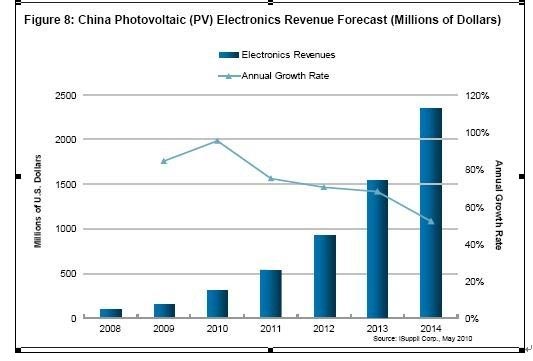 隨著政府補貼計劃在2010年達到頂點,光伏電子市場也將同時觸頂。盡管預計接下來三年年增長率下降——除非出臺新的政策,但該市場將繼續(xù)保持一定的勢頭,足以在2014年實現(xiàn)24億美元的銷售收入。