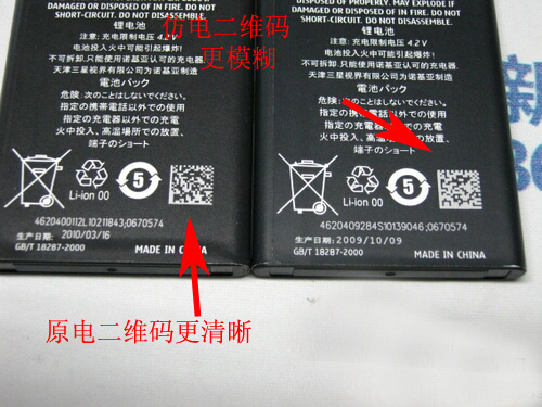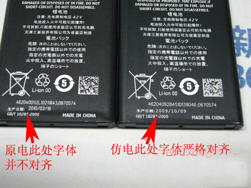 就標簽本身來說,仿真度高的仿電甚至會采用廢舊諾基亞原電揭下來的激光防偽標,因而在標簽本身上仿電可以做到和原裝電池一樣(據稱熟練工人可以做到很完美揭廢舊原電防偽標,每揭一個1元錢,而防偽標的價格則是一個10元錢,仿電不必要的成本多了,自然使用的保護電路、電芯等等方面就要縮水)但是由于仿電生產廠商和原電生產廠商規模上的巨大不同,仿電采用人工粘貼標簽,在平整度以及邊緣規程程度上相比機器粘貼會有很大差別。