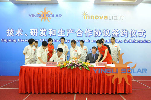 7月21日上午,英利集團與美國Innovalight公司技術、研發和生產合作協議簽約儀式在電谷廣場會展中心二樓會議室舉行,集團董事長苗連生、公司副總經理熊景峰、首席技術官宋博士與美國Innovalight公司CEO兼董事長、銷售副總Boris Mathiszik等共同出席簽約儀式。