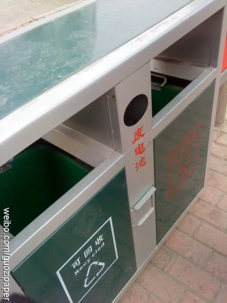 他們的方法就是在城市垃圾桶的設計改變了傳統的只有可回收和不可回收兩類,它在中間加了廢電池一欄用來回收居民丟棄的廢電池,這種垃圾桶在寧海這個小城市里面隨處可見,擺放在公交站牌周圍,沿街而設。