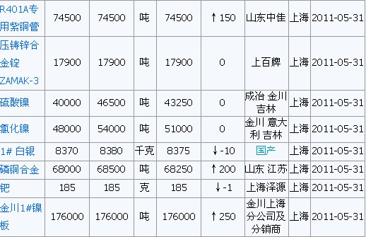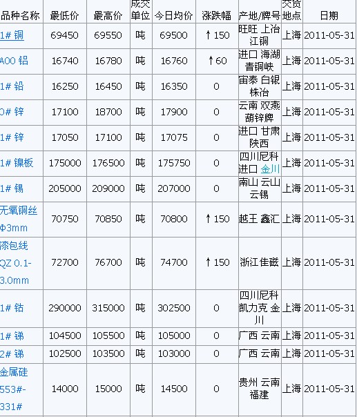 2011年5月31日長江有色金屬現(xiàn)貨上午快訊(銅鋁鉛鋅錫鎳)