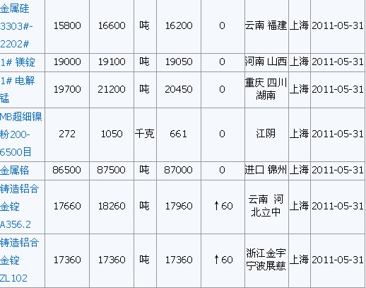 上一篇: 2011年5月31日重慶有色金屬市場行情