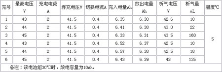 試驗(yàn)時(shí)間是在冬季,水溫5℃。實(shí)驗(yàn)條件是統(tǒng)一用2A電流充電,最充電電壓分別用43V、44V、45V輪循環(huán)依次進(jìn)行,浮充轉(zhuǎn)換電流一律400mA,記錄下每次的充電時(shí)間,包括充電末期隨時(shí)間電流下降各點(diǎn)數(shù)據(jù)、開(kāi)始析氣電壓,按時(shí)間記錄析氣量。電池充完后,用萬(wàn)分之幾精度的電量臺(tái)記錄放電容量。充入電量是在計(jì)算紙上讀出時(shí)間電流曲線與坐標(biāo)之間的面積(電容量就是充電電流對(duì)時(shí)間的定積分)。