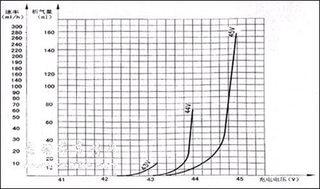 從上圖表可以看出,電池在42.5V~43.5V時(shí)開(kāi)始析氣,而析氣的速度與充電電壓有關(guān)。到充電結(jié)束時(shí),總析氣量與充電最高電壓有關(guān),43V與45V總析氣量相差10位(注:以單格允許極限失水10克,18格相當(dāng)240公升氣體,該電池45V時(shí)失水并不大)。在充電末期電流下降區(qū)時(shí),只要降低電壓到42.5V時(shí),析氣立即停止,這時(shí)充電電流稍小一點(diǎn),還會(huì)依著原來(lái)的規(guī)律下降。