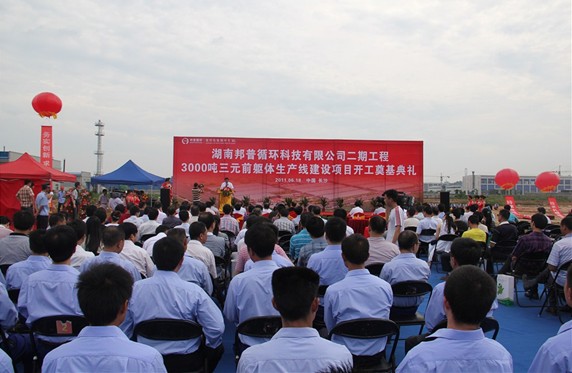2011年6月18日,邦普湖南基地二期3000噸鎳鈷錳三元前軀體生產線建設開工奠基典禮隆重舉行,邦普所在湘粵兩地相關政府領導,行業相關產業鏈企業代表200多人參加了奠基典禮。這標志著邦普已強勢擴能、并全面角力三元前軀體材料市場鰲頭地位。