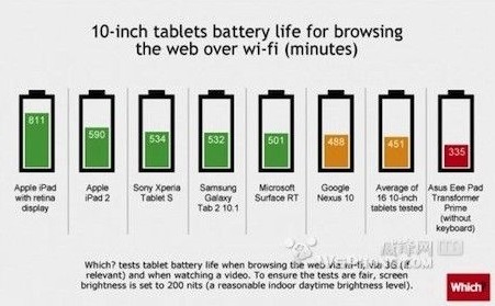 在參與測(cè)試的7款10英寸類的平板中,使用Wi-Fi瀏覽網(wǎng)頁時(shí)配備Retina顯示屏的iPad排名最前,續(xù)航時(shí)間達(dá)到811分鐘;iPad2排名第二,續(xù)航時(shí)間為590分鐘。相比之下Samsung Galaxy Tab2 10.1的續(xù)航時(shí)間為532分鐘,微軟Surface RT為501分鐘;華碩EeePad Transformer Prime是續(xù)航時(shí)間最短的,僅有335分鐘。