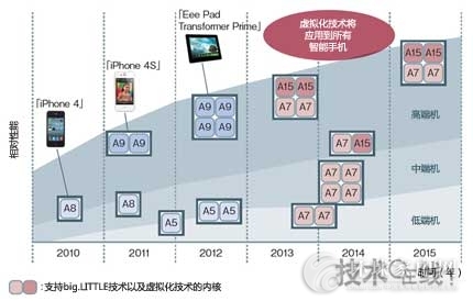 ARM公司在2010年9月發布了該公司首款采用虛擬化技術的內核Cortex-A15,當時未必明確了在移動領域如何利用虛擬化技術。Cortex-A15不同于此前ARM公司的CPU內核產品,專門面向該公司近年著力發展的服務器領域。因此,估計是為了滿足該領域的需求,才在Cortex-A15中采用了虛擬化技術。