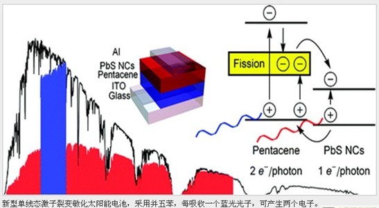 文章中說:“我們演示了一種有機(jī)/無機(jī)混合的光伏設(shè)備架構(gòu),采用單線態(tài)激子裂變(singlet exciton fission),每吸收一個高能光子,可以收集到兩個電子,同時,也可以利用低能量的光子。這種太陽能電池,紅外光子吸收使用硫化鉛(PbS: lead sulfide)納米晶體。可見光光子的吸收采用五環(huán)素,以創(chuàng)造單線態(tài)激子,經(jīng)過快速激子裂變,產(chǎn)生配對三重線態(tài)(triplets)。最重要的是,我們確定,這些三重線態(tài)激子可以電離,這要采用有機(jī)/無機(jī)異質(zhì)結(jié)面(heterointerface)。我們報(bào)道的內(nèi)部量子效率超過50%,而功率轉(zhuǎn)換效率接近1%。這些結(jié)果表明,有一種替代方法,可以規(guī)避肖克利-奎伊瑟極限(Shockley-Queisser limit),就是單結(jié)太陽能電池(single-junction solar cells)功率轉(zhuǎn)換效率的極限。”