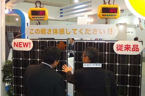 在“PV EXPO 2012”上Fujipream的展區,將模塊懸掛在秤下面強調了重量之輕。