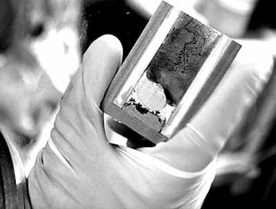 液態金屬電池的制造技術已經逐步升級。這里顯示了幾種電池,從直徑1英寸(約2.54厘米)的到目前最大的40厘米電池(表面有三個圓孔的)都有。在每個電池內,都含有兩種金屬用來充作電極材料和電解質。液態金屬的得名源于這兩種金屬通過加熱過程,最終融化為液態,經過自然分隔,形成三個不同的層次,以滿足電池的運行。