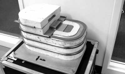 早期的液態金屬電池實物模型,顯示出堆疊在一起的電池單元。由厚厚的一層泡沫絕緣材料包裹著處于核心位置的電池。中心處的彩色材料片代表著熔化了的電池材料。