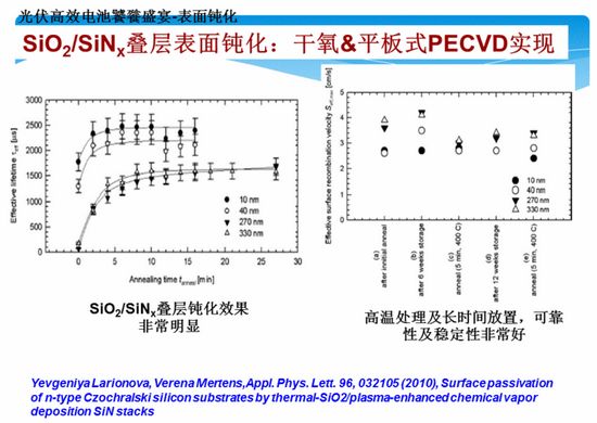 早期采用TiO2膜或MgF2/ZnS混合膜以增加對(duì)入射光的吸收,但該方法均需先單獨(dú)采用熱氧化方法生長一層10~20umSiO2使硅片表面非晶化、且對(duì)多晶效果不理想。SixNy膜層不僅減緩漿料中玻璃體對(duì)硅的腐蝕抑制Ag的擴(kuò)散速度從而使后續(xù)快燒工藝溫度范圍更寬易于調(diào)節(jié),而且致密的 SixNy膜層是有害雜質(zhì)良好的阻擋層。同時(shí)生成的氫原子對(duì)硅片具有表面鈍化與體鈍化的雙重作用,可以很好地修復(fù)硅中的位錯(cuò)、表面懸掛鍵,提高了硅片中載流子的遷移率因而迅速成為高效電池生產(chǎn)的主流技術(shù)。雙層SiN減反射膜,通過控制各膜層中硅的富集率實(shí)現(xiàn)了5.5%的反射率;而另一種SiN與SiO混合膜,其反射率更是低至4.4%,目前廣泛采用的單層SiN膜減反射率最優(yōu)為10.4%.