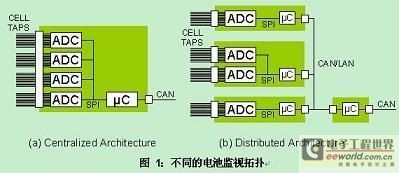 接下來,就給定的機械概念設計而言,監視硬件拓撲由精確定義的、所需支持的電池數量決定。在汽車應用中,一般情況下總共會有 100 個以上的電池測量點,而且系統的模塊化將決定一個給定的電路系統測量多少個電池。最常見的情況是,以安全斷接“維修插頭”方式,將所有電池分成至少兩個子組。通過在故障情況下保持電壓低于 200V,這種方法最大限度地降低了維修人員可能遇到的觸電危險。外形尺寸較大的電池組意味著,要采用兩套隔離的數據采集系統,每套也許支持 50 個電池分接頭。在有些情況下,所有電子組件都在一個經濟實惠的印刷電路板上,但是這需要大量互連,如圖 1 (a)所示。或者,電子組件也可以分散放置,更加緊密地集成在電池模塊中,但是這需要采用遙測鏈接方法。為了實現可靠的數據完整性,內置于汽車線束中的遠端測量功能電路必須采用一種堅固型協議,例如廣泛使用的 CAN 總線。盡管真正的 CAN 總線接口涉及幾個網絡層,但是可以很方便地采用 PHY 層構成 BMS LAN 結構,以高效率地進行模塊內的通信。這類分布式結構如圖 1 (b)所示。該拓撲允許在幾個小型處理器之間分配計算工作量,從而降低所需的數據傳輸速率,并減輕 LAN 方法可能引起的 EMI 問題。最終的 BMS 應用接口很可能是至一個主系統管理處理器的 CAN 總線接線,而且將需要定義 (或在一開始規定) 特定的信息事務處理。