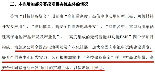 孚能科技表示,本次增加部分募投項目實施主體是基于公司戰略與公司實際經營發展的考量,旨在合理優化公司現有資源,加快全固態電池中試線建設進度,提升全固態電池研發實力,進一步提高募集資金使用效率,推進募投項目的順利實施,充分發揮新實施主體的地域優勢,符合公司長期利益及募集資金使用安排。